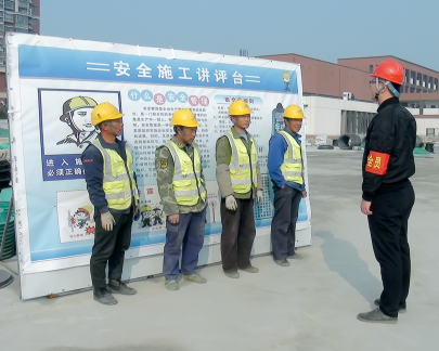 本工程施工范圍廣、涉及專業(yè)多,交叉施工影響大,安全文明管理難度高。為此項(xiàng)目部精心組織、科學(xué)策劃,從開展安全教育,提高全員安全意識(shí)著手,將安全教育工作常態(tài)化。并且嚴(yán)格實(shí)行工程安全技術(shù)交底制度、定期組織應(yīng)急演練、施工現(xiàn)場(chǎng)設(shè)置醒目的安全警示標(biāo)志,時(shí)刻提醒工人安全生產(chǎn)、規(guī)范作業(yè)。